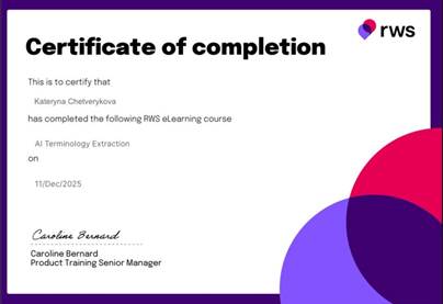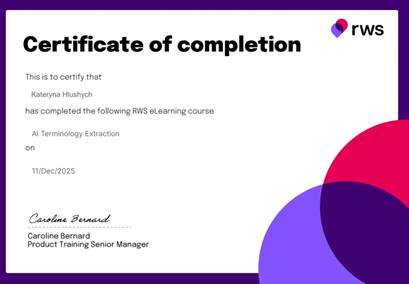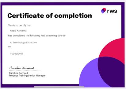 11 грудня 2025 року здобувачі вищої освіти освітньої програми «Германські мови та літератури (переклад включно), перша – англійська» в рамках навчальної дисципліни «Практика перекладу з англійської мови» успішно пройшли курс RWS eLearning course AI Terminology Extraction на RWS Trados Studio.