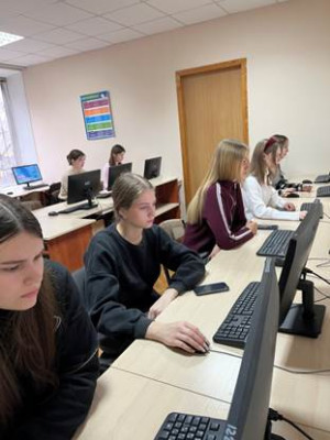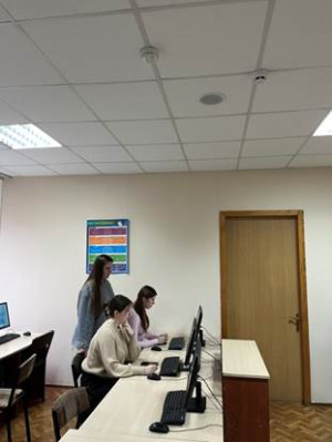 Студенти 1 курси під час виконання завдань Інтернет-олімпіади (зліва направо Гарашко Ю., Сіонська А., Куценко Є.)