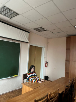 Викладач кафедри української та іноземних мов Ємець Світлана Олегівна в корпусі Філософського факультету Афінського національного університету імені Каподістрії, де проходили заняття групи Г2