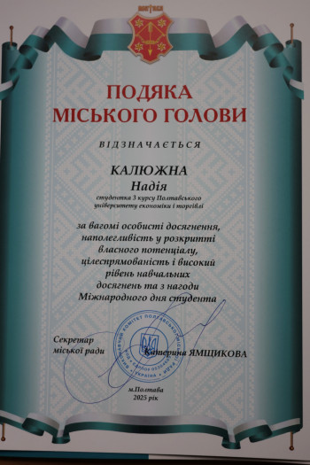 Науково-педагогічні працівники кафедри української, іноземних мов та перекладу щиросердно вітають Калюжну Надію, студентку третього курсу, яка відзначена Подякою міського голови за вагомі особисті досягнення, наполегливість у розкритті власного потенціалу, цілеспрямованість і високий рівень навчальних досягнень та з нагоди Міжнародного дня студента.